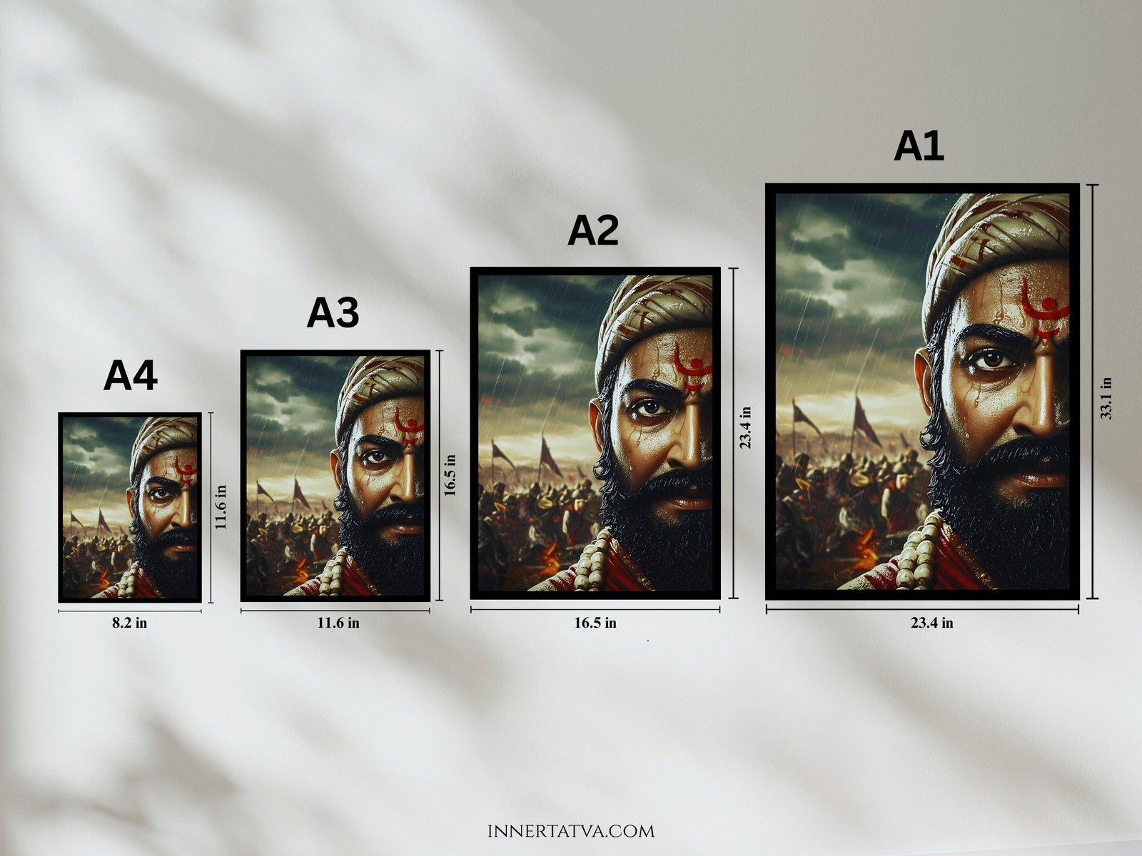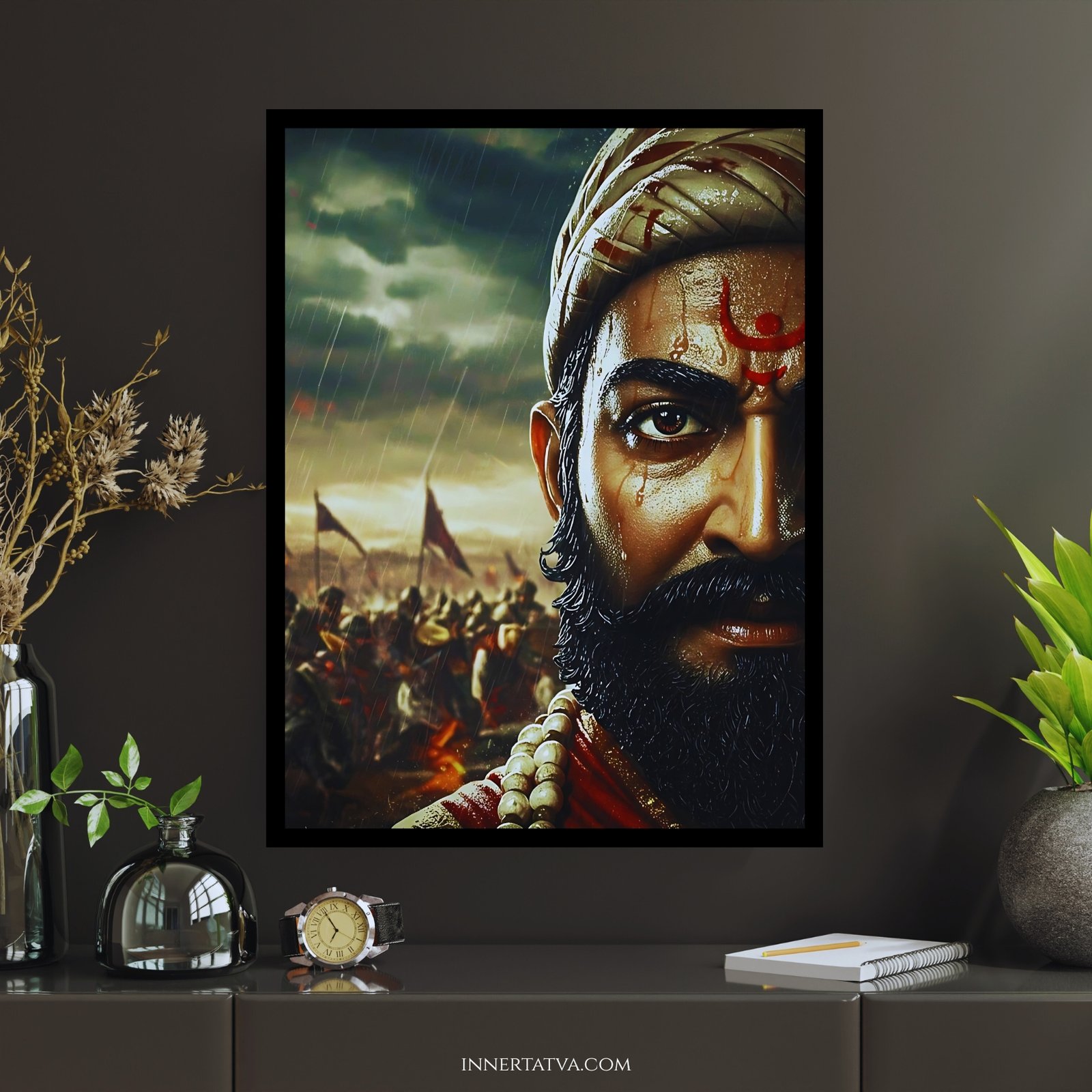 • High-Quality Artwork – A striking portrait of Chhatrapati Shivaji Maharaj in battle, with rain effects and intense detail that radiates power and pride.