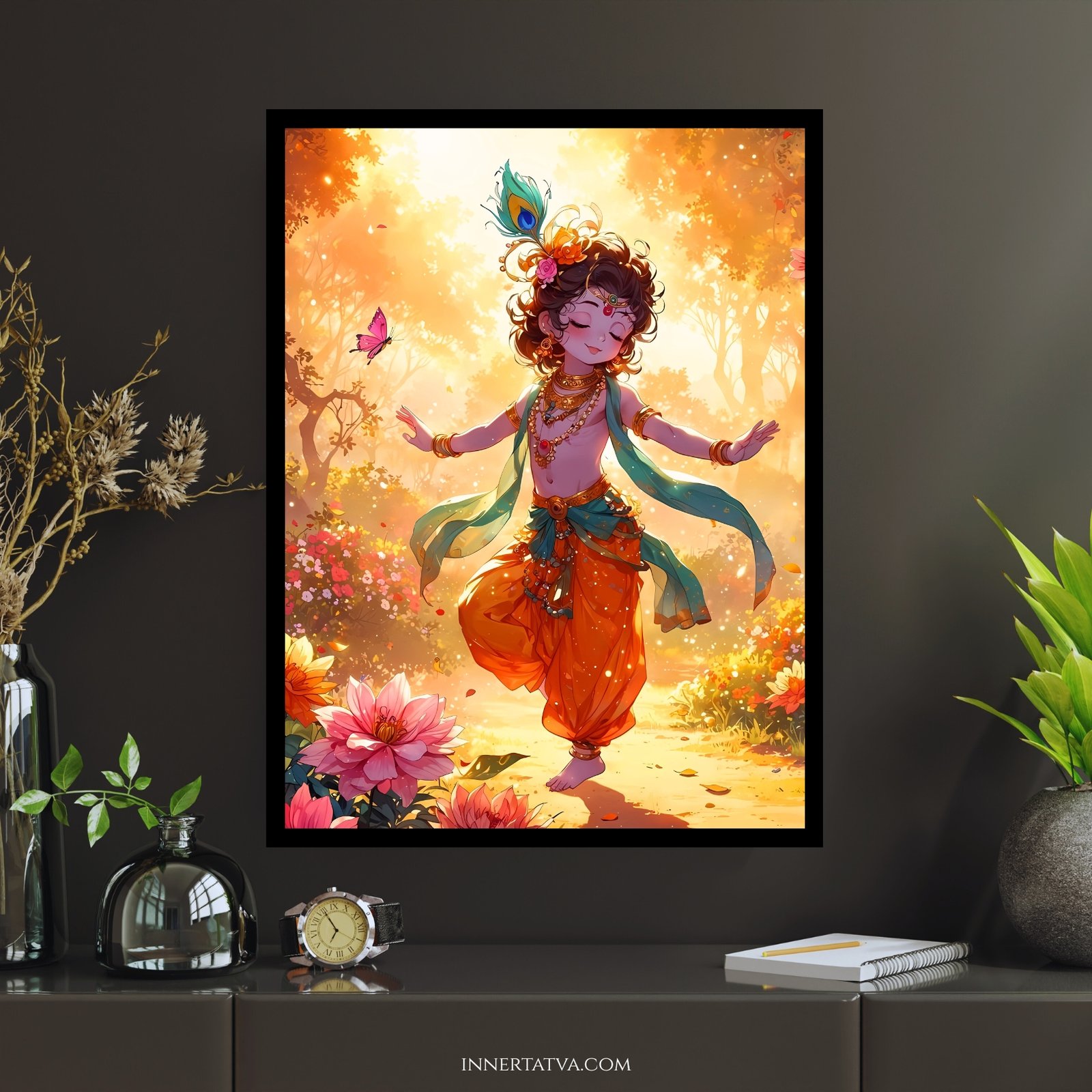 Depicting young Krishna gracefully dancing amidst a forest full of flowers, with a butterfly fluttering nearby, this artwork radiates innocence, charm, and divine happiness. With its warm golden glow, it spreads positivity, purity, and delight in every corner of your space.