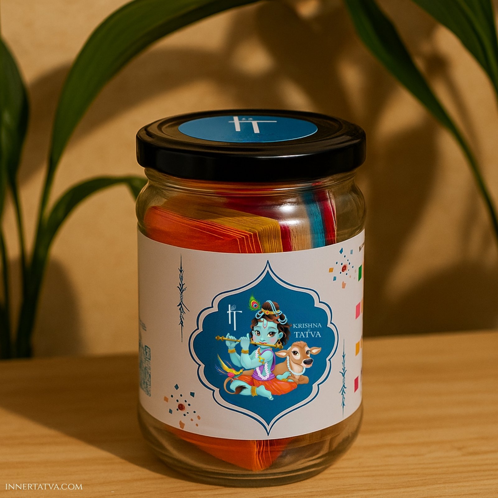 The Krishna Tatva Gita Jar is your daily source of divine guidance. A beautifully designed glass jar holding 64 thoughtfully curated slips, each featuring an original Sanskrit Shloka from the Bhagavad Gita along with its Hindi & English meaning.