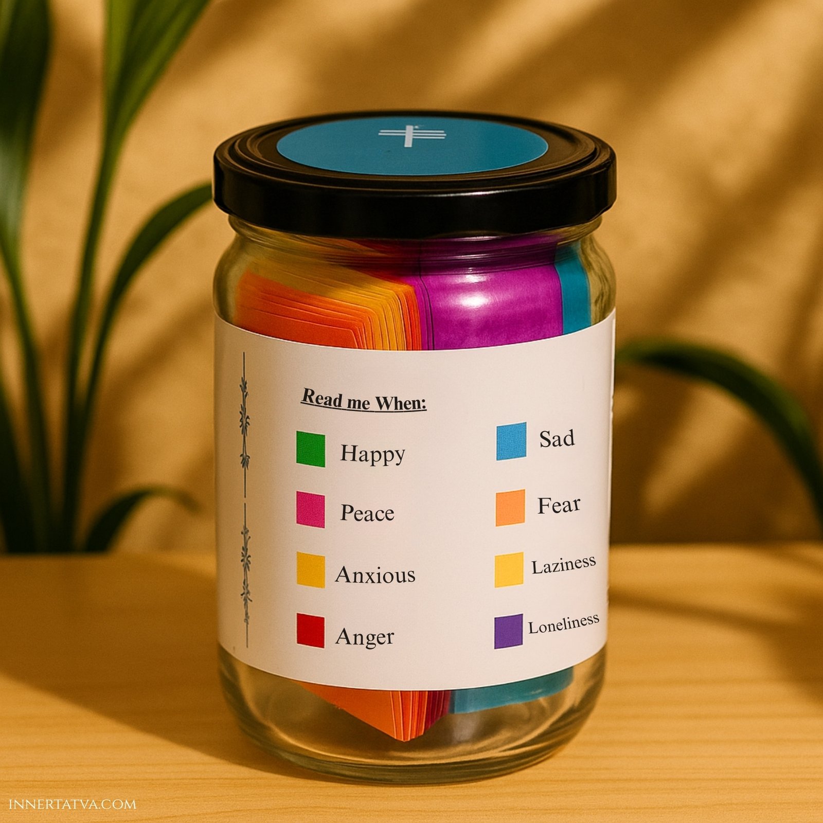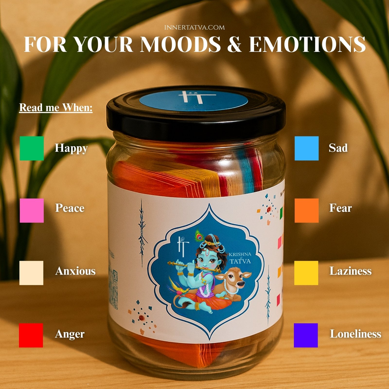 Each slip is color-coded by emotion – Happiness, Sadness, Peace, Fear, Anxiety, Laziness, Anger, Loneliness – so you can simply choose the one that matches your current state of mind. Whether your heart feels heavy or joyful, Krishna’s timeless wisdom will be there to guide you, calm you, and remind you of life’s deeper truths.