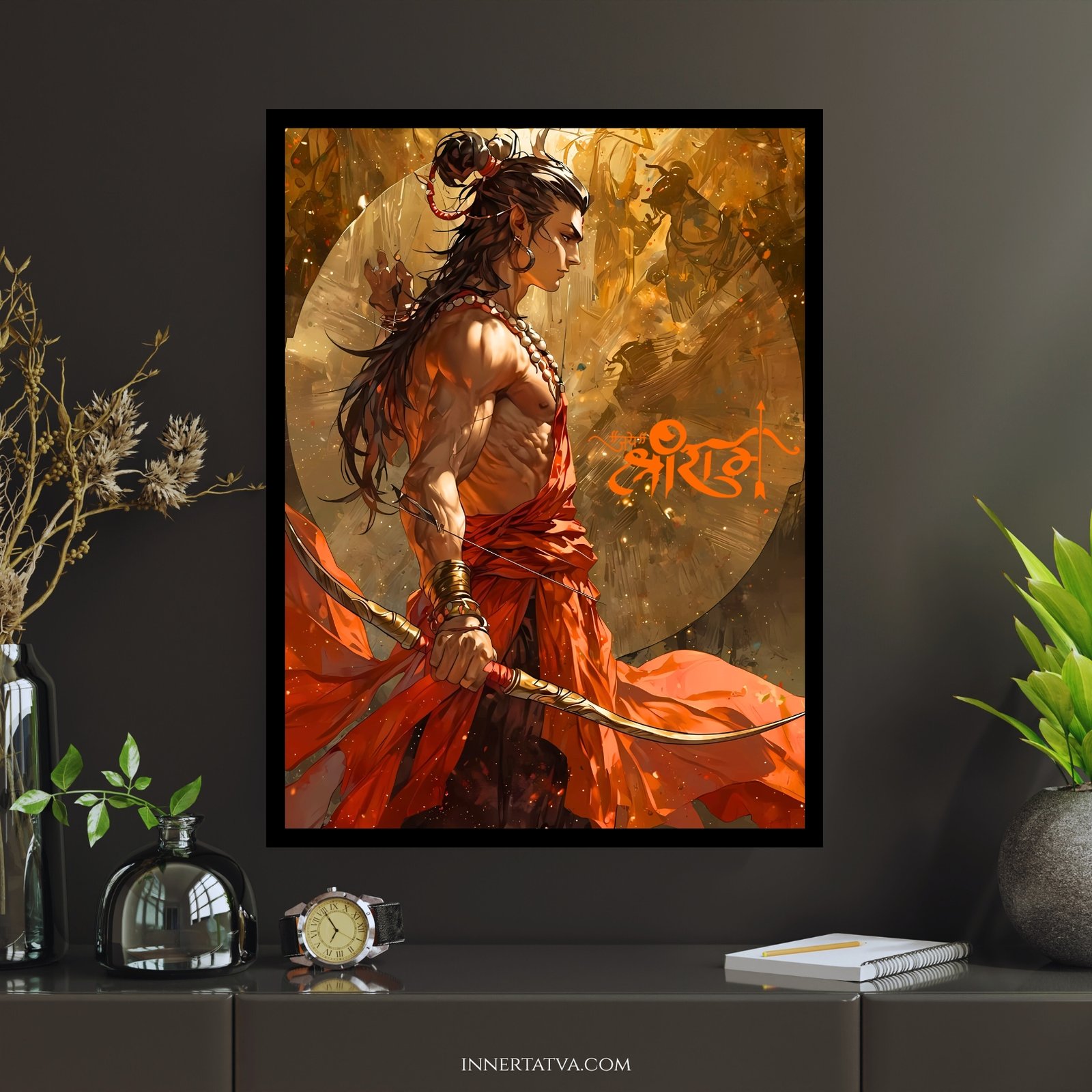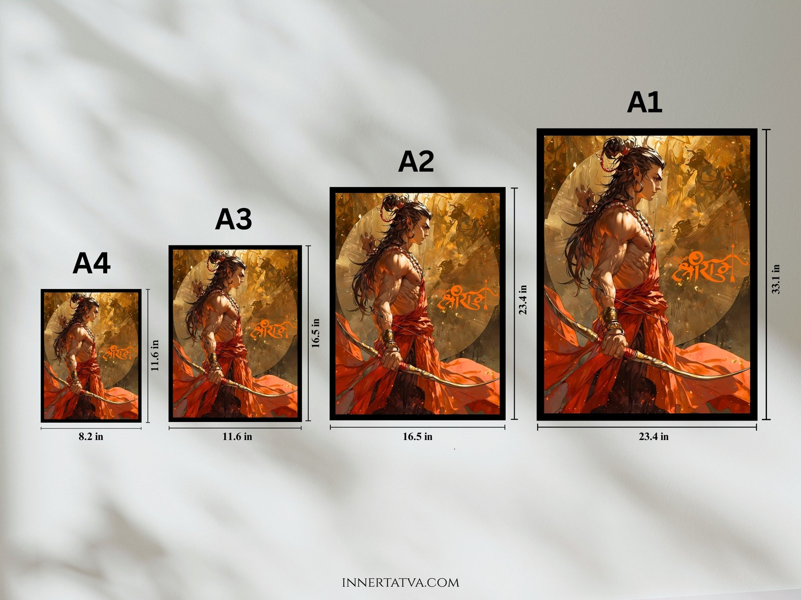 - High-Quality Anime Artwork – Bold anime detailing of Lord Ram with his bow, radiating divine power and grace.